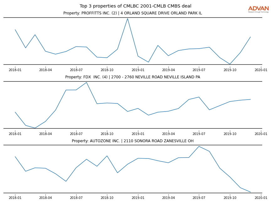 Advan Research computes accurate daily foot-traffic for all the properties and loans of the CMLBC 2001-CMLB deal. Here is the foot-traffic aggregated across all the properties of the deal: