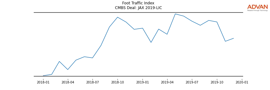 Advan Research computes accurate daily foot-traffic for all the properties and loans of the JAX 2019-LIC deal. Here is the foot-traffic aggregated across all the properties of the deal: