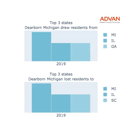 ADVAN measures the inbound, outbound and net migration to the city of Dearborn Michigan for the years 2015, 2016, 2017, 2018, 2019, 2020, 2021, 2022 and 2023. Data displayed on the charts above are annually aggregated but using our product REPerspectives, it can be analyzed with monthly granularity by State, Zip, County and Census Block Group. Additional reports are available for the city residents, employees and tourists.