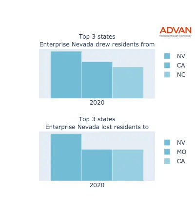 The state that most migrants moved from (origin state, excluding Nevada itself) to Enterprise Nevada was California. The state that most migrants moved out (destination state, excluding Nevada itself) from Enterprise Nevada was California.