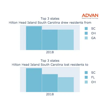 ADVAN measures the inbound, outbound and net migration to the city of Hilton Head Island South Carolina for the years 2015, 2016, 2017, 2018, 2019, 2020, 2021, 2022 and 2023. Data displayed on the charts above are annually aggregated but using our product REPerspectives, it can be analyzed with monthly granularity by State, Zip, County and Census Block Group. Additional reports are available for the city residents, employees and tourists.
