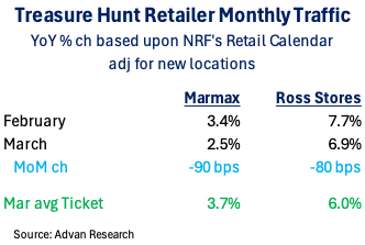 We’ve seen sell-side reports calling out off-price (which we include in treasure hunt retail) as having softer traffic in March. Like with the perceived slowdown in mall traffic in March, we suspect that the “called out softness” is the result of analysts not aligning to the NRF retail calendar, but holding to the nominal calendar, which results in apples-to-oranges comparison, namely a 9-weekend day period to a 10- weekend day period. The table below uses the NRF retail calendar. And so, on an apples-to-apples basis, traffic was moderately less in March, but ticket remains robust. Ticket growth is being driven by product mix, i.e. more better & best, or stronger & stronger treasure hunt scores. That demonstrates ongoing success by the two’s merchants in finding compelling sources and pallets to buy. Strong finds bring back the traffic in the next month. As such, we expect April to be another very strong month for Marmax and Ross Stores.