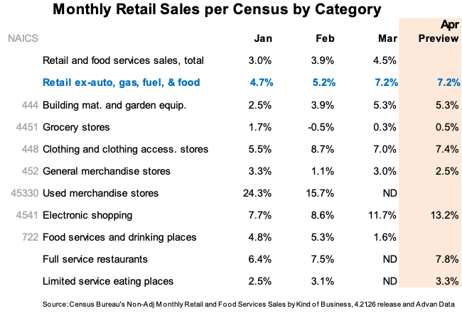 As previewed, March retail sales, per the Census Bureau’s monthly report, were robust and above market expectations (and our preview). Our definition of discretionary retail sales is the total, less gas, fuel, auto, and food, and we show that in the blue font in the table below. In light of gas prices and the Middle East, that discretionary spend accelerated during March is remarkable. Census’ seasonally adjusted figures tell a similar story, as did the commentary from the managements of bank and credit card providers during this earnings season. Luxury brands also spoke of acceleration in US demand (potentially due to less travel to Europe.) The March report also demonstrated that the macro trend of GLP-1 adoption remains at play, with the GLP-1 uptake fueling the apparel super-cycle and cutting spend at limited-service restaurants. Retail revenue growth for grocery also remains anemic as significant market share continues to flow to club, mass, and Amazon. Given the strength in “electronic shopping,” we expect Amazon to report robust top-line results for its North America Retail segment. On a more micro-level, secondhand stores remain very dynamic (see SVV). On a separate note, we’ve seen sell-side notes pointing to an abrupt slowdown in traffic during March at limited-service and off-price. As discussed in our preview, we see NO EVIDENCE of any traffic slowdown. (MCD should report solid traffic results).