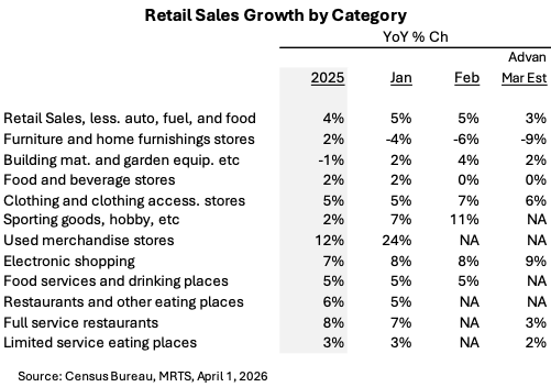 The Census Bureau’s February monthly retail sales report, along with a positive revision for January, shows solid strength in consumer spending for the start of the year, as well as a continuation of heightened spend growth for two of 2025’s winners – apparel and secondhand. Apparel is in a “super-cycle” fueled by the uptake of GLP1s for weight loss, and secondhand is fueled by the vintage fashion rave and the K-shaped economy. (See our intro to 2026 here.)March’s activity stepped down from the strong Jan / Feb pace due to: adverse weather, the “CNN effect” of Iran / oil, the fall in equity markets, and growing consumer unease about employment and inflation. We see the weather impact in softer full-service restaurant visitation and an acceleration in fulfillment center activity (i.e. Amazon). Costco will report its March sales results in the coming week; Costco’s observed traffic was similar MoM, with any dampening from the weather being offset by strong visits to the fuel centers. That said, Costco’s traffic in California was similar MoM at +4.7%, and so, maybe its great treasure-hunt and deep value were similarly strong MoM. (Sam’straffic in California was +2.1% in March, slightly stronger than February’s +1.7%)