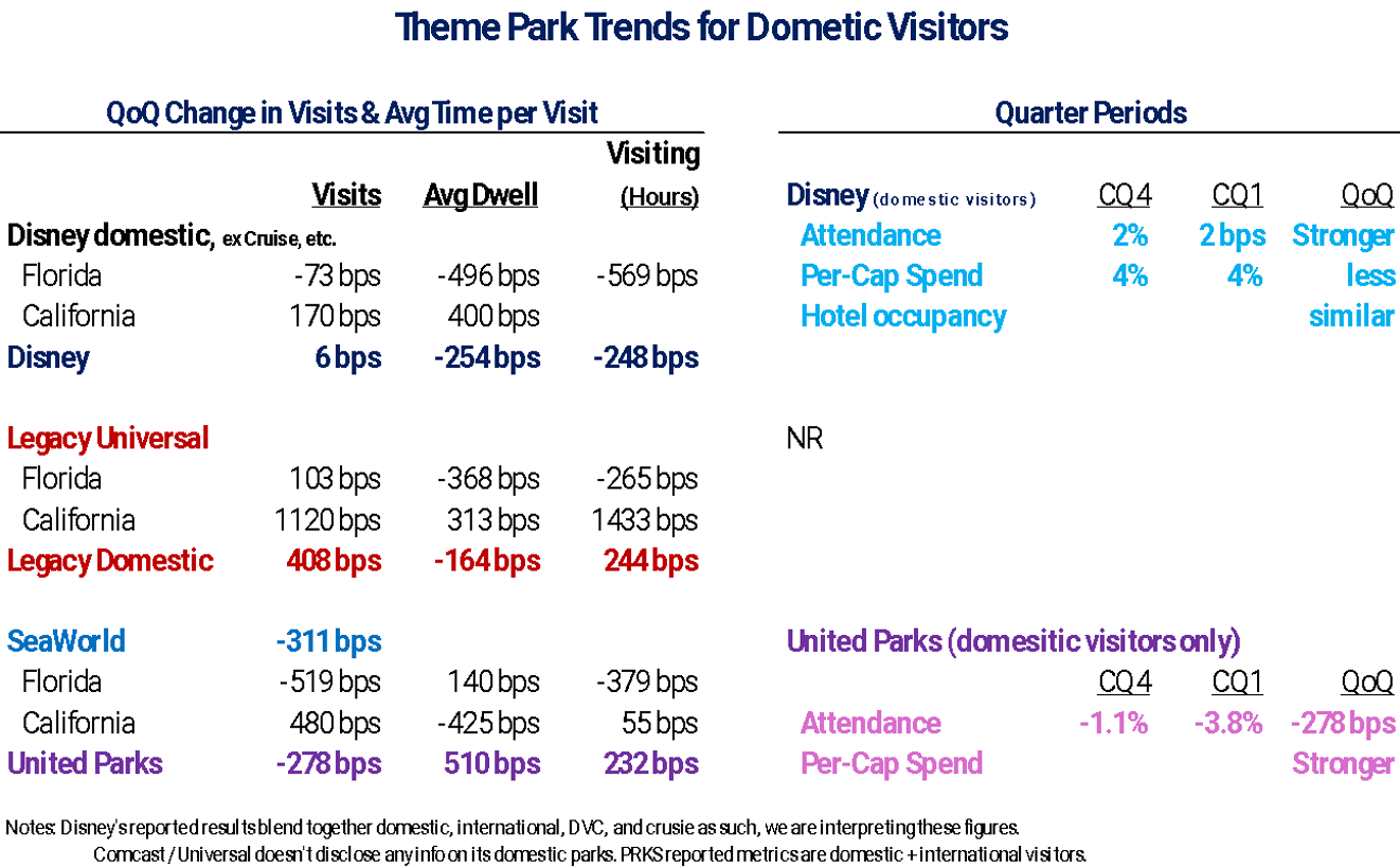 United Parks & Resorts is going to report a softer quarter; however, Q1 is a seasonally low quarter (only 17% of annual revenue). As such, we don’t think it’s a good read for the summer season, especially as United Parks & Resorts is likely holding back on marketing so that it can light up the summer season. Like with Disney and Universal, California was much improved, but Orlando is where SeaWorld’s weight lies, and the sequentially softer visitation has pulled the total lower. That suggests that Epic is a near-term competitive headwind, especially if SeaWorld pushed marketing dollars from Q1 to the April / May period. Observed spend data for SeaWorld was -300bps softer QoQ, and reflective of the softer attendance. We are pressed to explain the trend in dwell time at SeaWorld Orlando, relative to the market’s trend, or SeaWorld San Diego’s. Perhaps those who attended in Orlando were diehards who wanted to get their money’s worth, whereas the trend in San Diego reflected added new visitors who had yet to learn to maximize their time in the park.