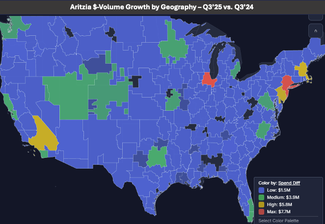 Last week, we presented our learnings on this year’s holiday season to Morgan Stanley’s institutional investor clients. In that, we highlighted Walmart, Dick’s Sporting Goods, Five Below, Ross, and specialty brands American Eagle, Gap, and **Aritzia **as having a very strong season. On Friday, Aritzia reported fiscal Q3 results (November period end), and yes, FQ3 and holiday results were very strong. Revenue growth for the US region accelerated 14 ppts QoQ to +54% YoY. Management guided to FQ4 revenue growth of “high-teens” with the implied outlook for the US to be in the 20s. That’s conservative; as shown below, observed spend for December was in the 50% range and December represents over 50% of fiscal Q4. Where is Aritzia growing?