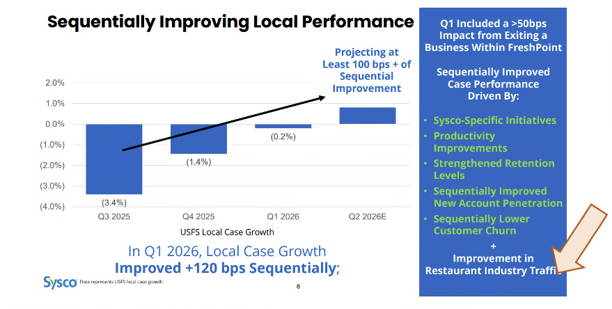On the earnings call, Sysco CEO Kevin Hourichan said, “In the quarter, our local volumes improved sequentially every month of the period. During the quarter, our rate of local volume improvement was more than two times the overall industry traffic rate of improvement. The positive inflection versus industry traffic was the strongest in September. Once again conveying the progress that we made throughout quarter… Per Black Box restaurant traffic in FQ1 improved by 60 basis points. As a result, Sysco improved more than 2x the overall injury in the quarter. We are pleased that industry traffic improved, and it is even better to see Sysco improving at a faster clip. As I mentioned earlier, September was the strongest month of the quarter for Sysco and the strongest month of positive variance versus the industry. Importantly, Sysco has continued to make progress in October. Given the strong start to FQ2, we anticipate that we will improve our total US local by at least an additional 100 basis points in FQ2 versus FQ1, continuing our positive momentum.”