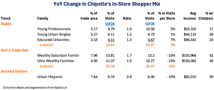 CEO, Scott Boatwright’s statement “Our path for further success lies in leaning into what differentiates our brands, accelerating innovation into new offerings and occasions that are of growing importance to our guests…” A comment that indicates that the brand needs to change to meet consumers’ changing needs; what’s changed most meaningfully in the food space, in our opinion, are GLP-1s and price fatigue by consumers. As it relates to Chipotle, the Wealthy Suburban Families and **Ultra Wealthy Families **cohorts are less likely to be “price fatigued.” Moreover, other than Hispanics, the data show no other meaningful decline for other cohorts. Moreover, a pullback by younger urban college-educated doesn’t appear to be Chipotle’s problem (at least for where we have data, we don’t have data for locations in urban canyons like Manhattan).