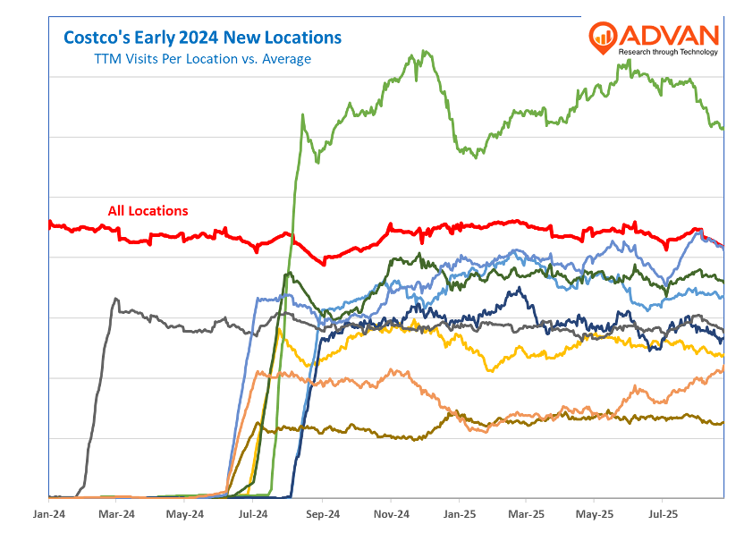 Given the favourable membership and macro trends, management indicated that they will continue to open a consistent number of new clubs, remember that Sam’s is newly expanding in the US. As shown below, new locations open explosively, but they take a number of years to mature. Sometimes, there are very strong new locations like the one at Tomball, TX that opened in July ’24, and Riverbank, CA – June ’24. As the second panel shows, the new Tomball location has put the hurt on the neighbouring Walmart. By contrast, the Target in Riverbank has seen its traffic undiminished.