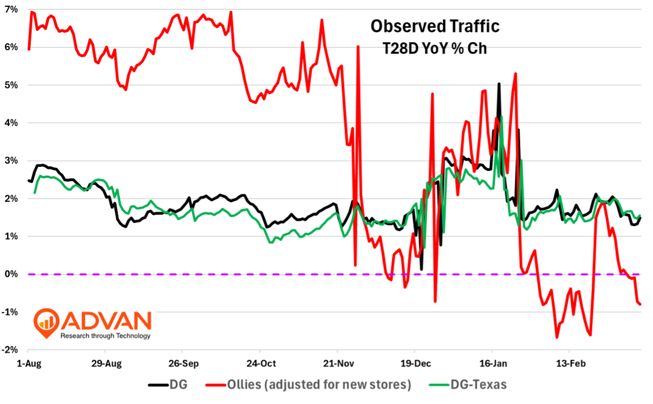For FQ4, Dollar General (DG) reported increases of +4.3% / +2.6% / +1.7% for comp-sales / comp-transactions / +1.7% comp-ticket. **Observed traffic and average ticket **increased +2.2%* / 2.5% respectively. As shown in the traffic chart, to a degree, the quarter-to-date traffic was impacted by the winter storms (Ollie’s more so). However, DG’s trend in Texas (and Florida for that matter) still looks similar to the nationwide trend, i.e. softer in February. Moreover, softness also demonstrates that there has been little lift from this year’s higher tax refunds (as many market commentators had hoped / hypothesized). DG’s discretionary categories like seasonal and home outperformed (as they have all year) and that boosted sales, ticket, and gross margin rate. Congrats to its merchants for getting the right mix and value into the stores. A decline in units-per-transaction (UPT) suggests that traffic is somewhat bolstered by a paycheck cycle effect. Consistent with management’s comments, there has been little change in DG’s customer mix since Q4’2023**, i.e. its customer gains are evenly spread across customer segments. Guidance for FQ1 comps was “the low 2s”, i.e. conservative (especially in light of the recent surge in oil prices), but in line with the observed February traffic and ticket trend. (Easter aligns better this year April 5th vs. April 20th in ’25).