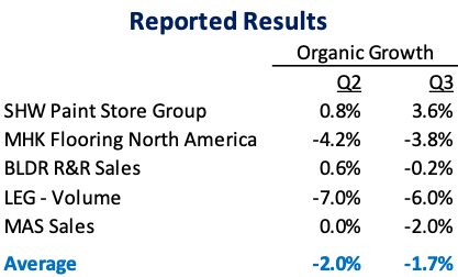 We next looked at our credit card data for the two; importantly, this data is more applicable to Lowe’s given that roughly 75% of the business in DIY and largely POS transactions. By contrast, Home Depot is majority commercial, which is typically a billed business; the POS is not the store’s registers, thus this large part of the business is missing from credit card data. Not unexpectedly, transaction data for Lowe’s is softer QoQ due to the hurricane comp; August was up; September / October are down. However, on a two-year basis – traffic and spend meaningfully improved QoQ. Additionally, average check also strengthened, implying more big-ticket spend (appliances, etc) and some recovery in larger projects. For HD, its DIY business, which was less impacted by Helene, was similar QoQ, both on a 1- and 2-year basis; its West exposure likely hinders both. Depot’s average ticket also slightly improved. If the pace of demand for R&R was quickening, Home Depot and Lowe’s would be increasing their in-stocks and inventory, and that would show up in better sales for the building material suppliers. The table below shows calendar Q3 organic growth for five leading suppliers, which improved slightly QoQ, but “slightly” is the operative word. And so, for home improvement, the trend is improving, but there’s been no step-change improvement and it has not been “egalitarian” – a word that we will come to shortly.