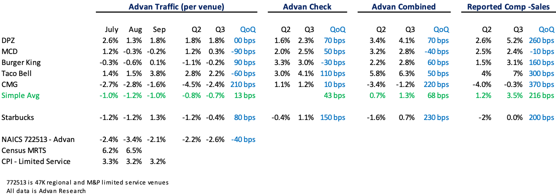 Also as a reminder, local / independents are taking traffic share, a topic of our story on Sysco’s earnings; industry peer Performance Food Group is experiencing the same trend with COO Scott McPherson saying, “Starting with Foodservice, the segment built upon its momentum by accelerating independent case growth compared to FQ4 and maintaining chain case growth in the low single digits… On an organic basis, Foodservice cases grew 5.1%, fueled by 6.3% organic independent case growth. Our chain business grew cases 4.4% in the quarter.” In other words, independents grew faster than chains. Moreover, management said that the trend was consistent throughout the quarter and that October was “very strong.” Next, the summary table of reported results for limited-service national brands shows that comp sales improved by +200bpys QoQ. Per Advan’s data, the acceleration was driven 2/3rds by average-check and 1/3rd by traffic. Others were pointing to a deterioration in traffic and sales, and that was not the case. Moreover, the table shows national brands, whereas the above chart is mostly independents; independents in full-service are outperforming which we wrote about in our analysis of Sysco / Chili’s results. And so again, no underlying slowdown.
