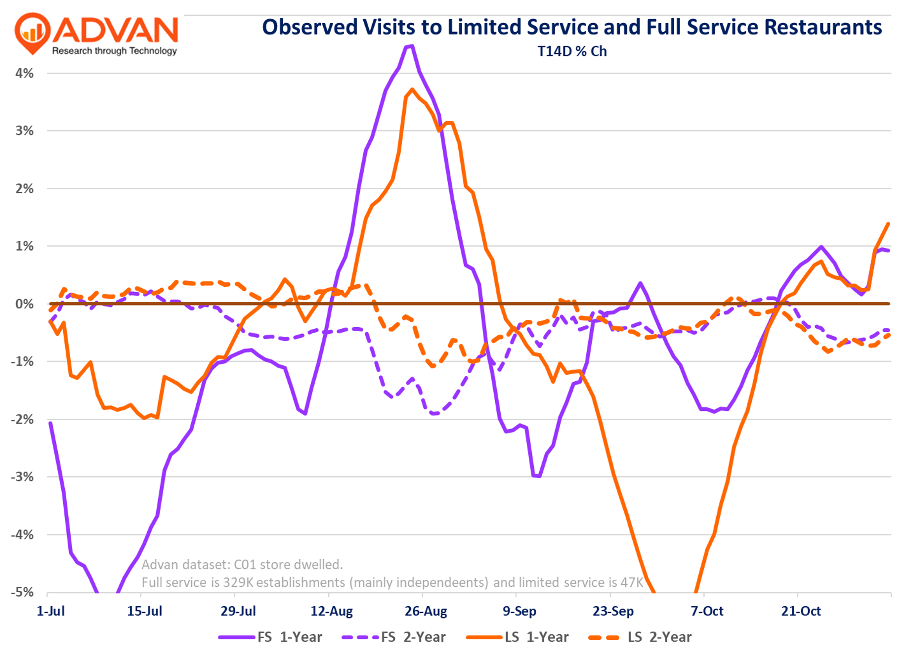 Chipotle CEO Scott Boatwright: Earlier this year, as consumer sentiment declined sharply, we saw a broad-based pullback in frequency across all income cohorts. Since then, the gap has widened, with low- to middle-income guests further reducing frequency. We believe that this guest with household income below $100,000 represents about 40% of our total sales. And based on our data is dining out less often due to concerns about economy and inflation. A particularly challenged cohort is the 25- to 35-year-old age group. We believe that this trend is not unique to Chipotle and is occurring across all restaurants as well as many discretionary categories. This group is facing several headwinds including unemployment, increased student loan repayment and slower real wage growth. We tend to skew younger and slightly over-indexed to this group relative to the broader restaurant industry. Finally, the promotional environment has intensified with value as a price point and menu innovation escalating throughout the year. Chipotle CFO Adam Rymer: So towards the end of July and into August, we experienced a step down like we talked about in our prepared comments. And that was somewhere around the 200 to 300 basis point range. And then as Scott mentioned in his prepared comments, we increased spend on our media as well as our promotions that helped offset some of the softness that we were seeing, specifically in August and September. And we also saw a strong reaction when we launched Carne Asada and even Red Chimichurri in early October. However, during this whole time, the underlying transaction trend remained under pressure and in recent weeks it softened even further. So when you account for this recent trend as well as the ongoing uncertainty in the economy, the way that we’re kind of looking at Q4 is really with a much more conservative view. And right now, at this point, we expect comps in Q4 to decline somewhere in the low to mid-single-digit range. (This cadence is clear in Advan’s observed visits data.)