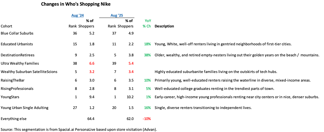 The following table demonstrates which psychographic consumer segments are trending favourably for Nike, and where the gains are is telling. The two segments experiencing declines Ulta-Wealthy Families and “Wealthy Suburban Scions” are not known as trend setters; they are trend followers that are late(ly) on OnRunning, HOKA, and New Balance, and not onto the new Nike, yet. By contrast, visitation by the trend setter cohorts are up double-digits. The young, well-off renters living in gentried neighbourhoods in first-tier cities went from Nike’s 15th (out of 80) most important segment to 11th. The athletic boomer – Destination Retirees, when from 9th to 5th. Young Urban Singles from 27th to 20th. Young Stars (early-career, high-income young professionals renting near city centers, or in nice, denser suburbs) remained #1 and outperformed substantially.