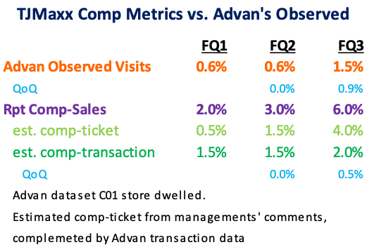 Comp-sales for TJX’s Marmaxx (TJMaxx and Marshals) division accelerated +300bps to +6% growth, due to like-for-like price increases and more better & best brands (+3%-ish), more UPT (+1%-ish), and stronger comp-transactions (+2%-ish). Similar to Ross, dwell-time increased (+3.2%); additionally, conversion rate was stronger given the faster rate of comp-transaction growth vs. observed visits.