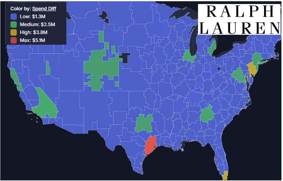 Shown on the third page, geographically by DMA, Coach is driving the most $-volume growth in LA, Chicago, and Dallas. Additionally, Minneapolis, Denver, and Tampa were also big drivers relative to their size. (Shown here is DTC consumer spend on the brands, which includes ecommerce, but excludes wholesale.) By contrast, for Ralph Lauren, it’s Houston, Miami, and Philadelphia. As shown, Denver, LA, and Dallas were also strong. Between the two brands, one can see that the outsized DMA $-growth are 2.6X higher in Coach’s favor. Coach’s US DTC business (both retail + ecommerce) is larger than Ralph Lauren’s DTC at $3.1B vs. $2.0B, but that’s only a 1.5X ratio. The 2.6X versus 1.5X indicates that while both are gaining market share, Coach is gaining more on a relative basis. That’s curious because Ralph has a much larger men’s business and it participates in more categories.