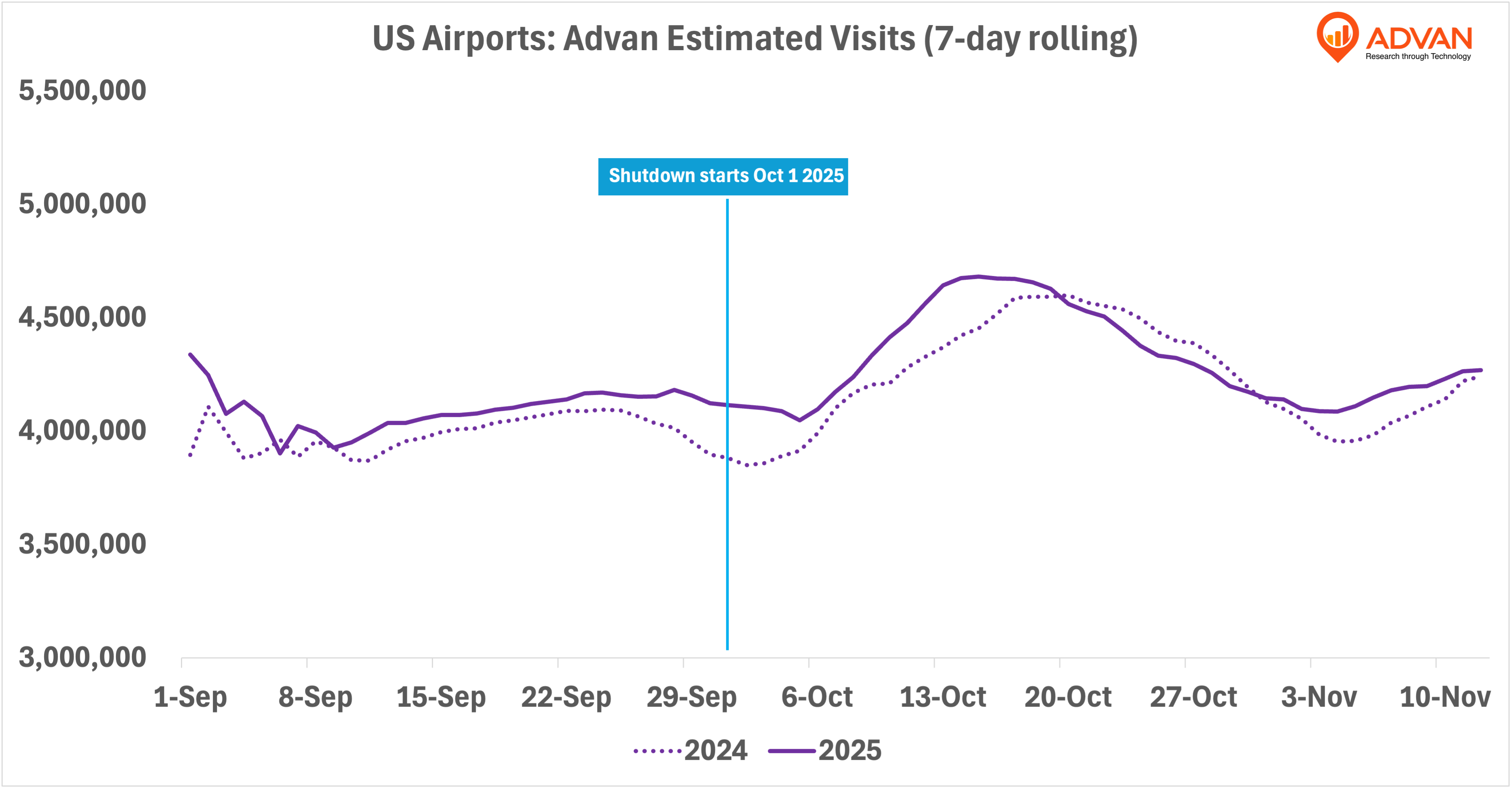 - Demand stayed strong: Both TSA and Advan show stable or increasing activity through the shutdown.