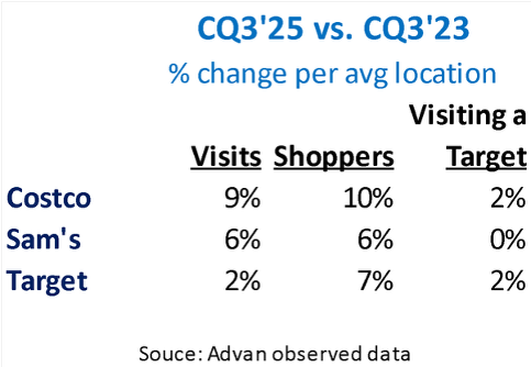 In our prior story on Target, we noted that while compelling and distinct merchandising (i.e. Tarjay) and store standards (out-of-stocks and service levels) may be inhibiting Target’s prior success, we believe their principle challenge is value perception in what we call our “extended thrifty K-shaped economy,” where (1) all consumers are fed up with the absolute level of prices, which is turning them to Costco, Sam’s Club, and Walmart, and (2) due to Target not having a full shop grocery offering. While Target does offer great value, its gross margin rate on merchandise is 27.1% (F2024), which is far above Costco’s 10.9% and Sam’s 8.6%. As such, by its business model, club offers greater value on a $ basis.
