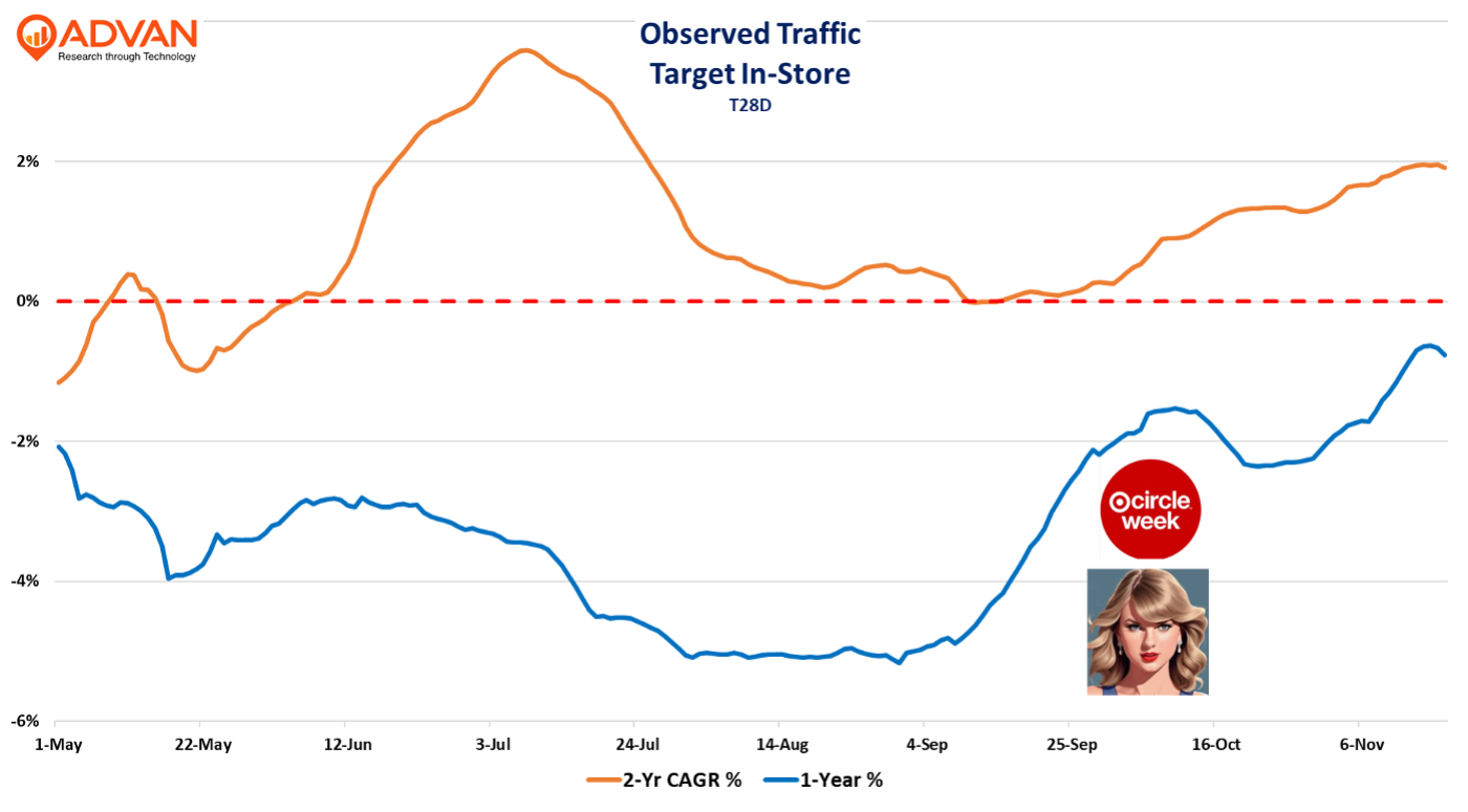 With Target’s FQ3 results, we wanted to circle back to our preview note , “Target – Updated views on Target’s performance, any good news?” In that note, we opined that there were a few key things to listen for in the results, while also highlighting the competitive challenges. Below we highlight those items, along with what we heard. Our conclusion from all of this is we see progress in both management qualitative comments and Advan’s data, especially in the month of October – a fairer month to judge progress given that incoming CEO Michal Fiddelke is just getting started with his strategic plan to right Target.