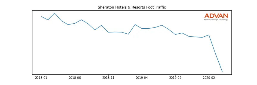 Advan Research collects and manually verifies all the individual Sheraton Hotels & Resorts locations worldwide, on a point-in-time basis. These detailed locations, also called Points Of Interest or POIs, are then used by Advan to compute how many mobile phones have visited the locations. Advan computes cellphone traffic using a dataset of more than 320 million cellphones observed with a second-level time accuracy and 10 meter location accuracy, since 2015. The graph below shows the visits aggregated across all 199 of the locations of Sheraton Hotels & Resorts: