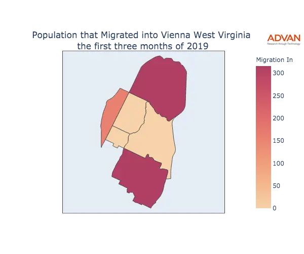 ADVAN measures the inbound, outbound and net migration to the city of Vienna West Virginia for the years 2015, 2016, 2017, 2018, 2019, 2020, 2021, 2022 and 2023. Data displayed on the charts above are annually aggregated but using our product REPerspectives, it can be analyzed with monthly granularity by State, Zip, County and Census Block Group. Additional reports are available for the city residents, employees and tourists.