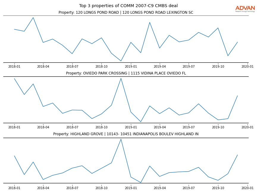 Advan Research computes accurate daily foot-traffic for all the properties and loans of the COMM 2007-C9 deal. Here is the foot-traffic aggregated across all the properties of the deal: