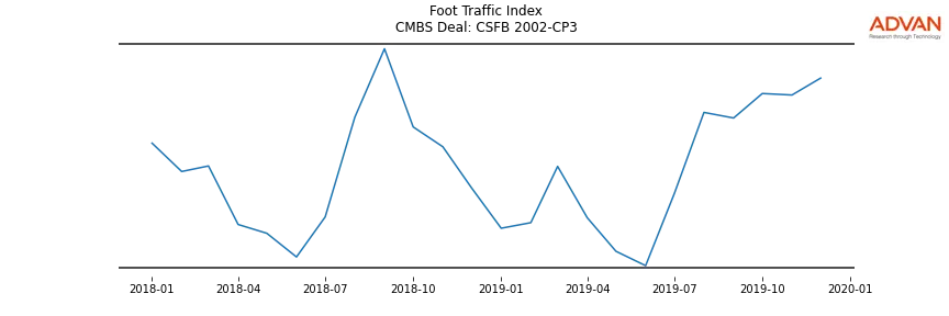 Advan Research computes accurate daily foot-traffic for all the properties and loans of the CSFB 2002-CP3 deal. Here is the foot-traffic aggregated across all the properties of the deal: