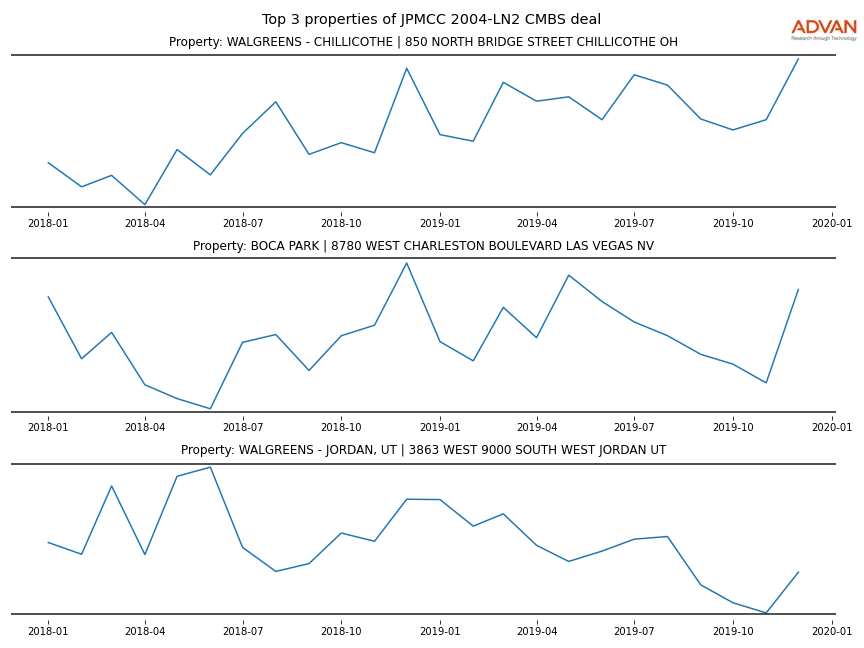 Advan Research computes accurate daily foot-traffic for all the properties and loans of the JPMCC 2004-LN2 deal. Here is the foot-traffic aggregated across all the properties of the deal: