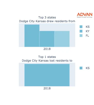 The state that most migrants moved from (origin state, excluding Kansas itself) to Dodge City Kansas was Kansas. The state that most migrants moved out (destination state, excluding Kansas itself) from Dodge City Kansas was Kansas.