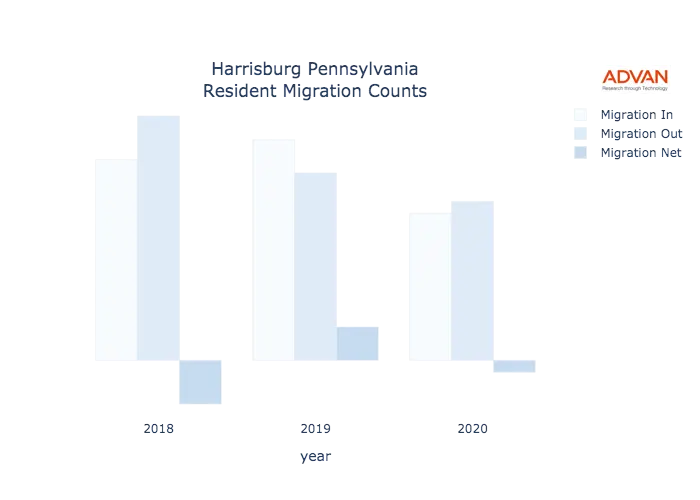 ADVAN measures the inbound, outbound and net migration to the city of Harrisburg Pennsylvania for the years 2015, 2016, 2017, 2018, 2019, 2020, 2021, 2022 and 2023. Data displayed on the charts above are annually aggregated but using our product REPerspectives, it can be analyzed with monthly granularity by State, Zip, County and Census Block Group. Additional reports are available for the city residents, employees and tourists.