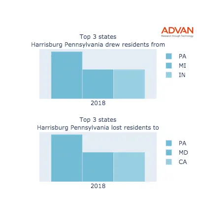 Harrisburg saw a net positive (inbound) resident count flow. There were -87 residents moved out of the state.