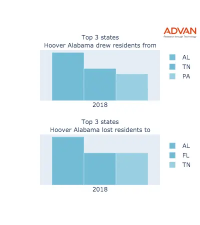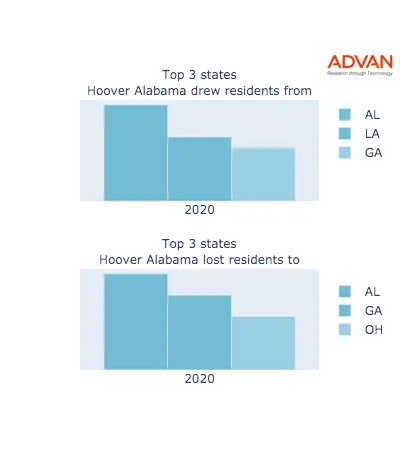 The state that most migrants moved from (origin state, excluding Alabama itself) to Hoover Alabama was Georgia. The state that most migrants moved out (destination state, excluding Alabama itself) from Hoover Alabama was Georgia.