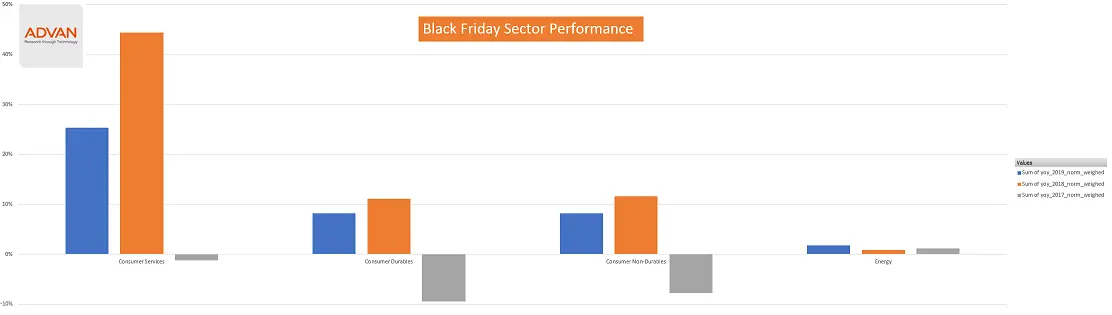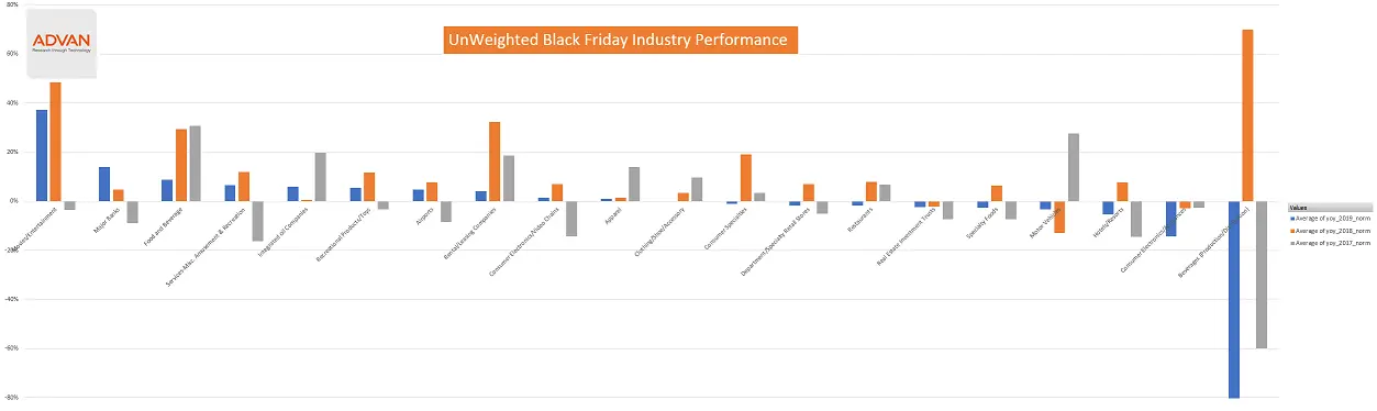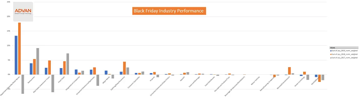 Department Stores, Restaurants, Malls, all continue growing their traffic on Black Friday on a year over yearbasis. The growth rate has decelerated a bit, but it's still in the healthy double-digit numbers, from an already highbase. Only Hotels showed negative growth, but less so than in prior years -- a weighted average of -1% vs -3% and -2% in 2018and 2017 respectively.Below are a couple of graphs that illustrate the traffic. Do not be fooled by the simplicity of the graphs, the dataunderlying them consists of 3 Trillion data observations across 2 Million geofenced locations pertaining to 1,400companies, all normalized using Advan's custom algorithms for reliable year over year comparisons. Simple is hard to do!Sector performance: This shows how many more people visited a sector on Black Friday than they did the year prior.
