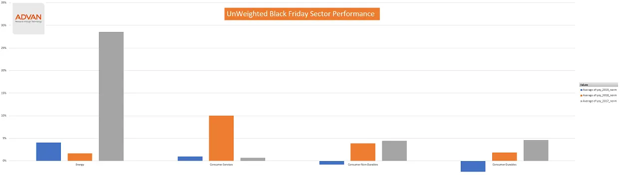 Department Stores and Restaurants lead the growth, followed by Malls ("REITS") and Supermarkets. Growth is generally more muted than in the prior years. Clothing, Shoes and Accessories are still growing, just not as much as they used to anymore. 1% vs last year's 4%. Apparel is flat, vs a 1% growth in 2017 & 2018. Hotels are slightly down -- people stick around with family apparently. Airports show 0.5% growth (note, this is only on Black Friday, not the whole week of Thanksgiving), but note that Gas Stations ("Integrated Oil Companies") grew 1.7%. It takes some driving to go to all these stores!It is important to keep in mind that the growth patterns above are not uniform across companies. In fact, onaverage* the Consumer sectors are down vs 2018. This means the big department stores / retailers / malls are dominatingthe growth (so that overall growth is positive) whereas most of the small chains are hurting (so that on average,traffic is down on a company by company basis):