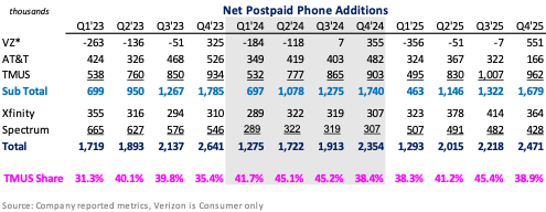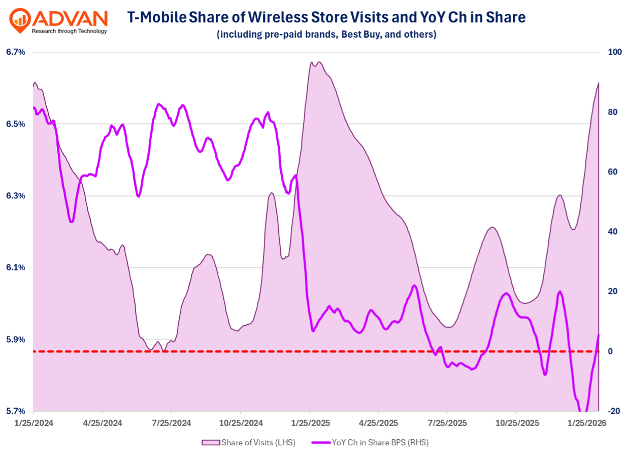 In terms of Advan’s observed visitation data**, what a diminution in T-Mobile prior “outsized market share capture” looks like is shown in the chart above. In the 1H’24, T-Mobile captured a massive +774bps of YoY market share in post-paid phone net adds. During the 1H’25, Verizon changed its pricing to deliver greater value to the consumer, as did Charter; the result, T-Mobile gave back -362bps of net add market share – still up a lot on a two-year basis. For the 2H and Q4, its market share gains were modestly up. The main differences in the market during the quarter were Verizon’s newfound tenacity (+551K subs) and the iPhone 17. T-Mobile’s Q4 results also revealed a moderation in net new postpaid accounts (not lines), which increased only +261K, down from Q3’s +396K and Q4’24’s +263K. The release stated that the decline was due to “higher industry switching,” i.e. higher competitive intensity. Postpaid phone churn was also substantially worse at 1.02%, up from last year’s 0.92%, Q3’s 0.89%, and consensus’ 0.95%, driven by “higher switching.” ARPU was lowered due to “increased promotional activity.” Quarterly EBITDA and free-cash-flow were pressured by Equipment Expense (i.e. dollars in Apple's coffers) and other competitive pressures.