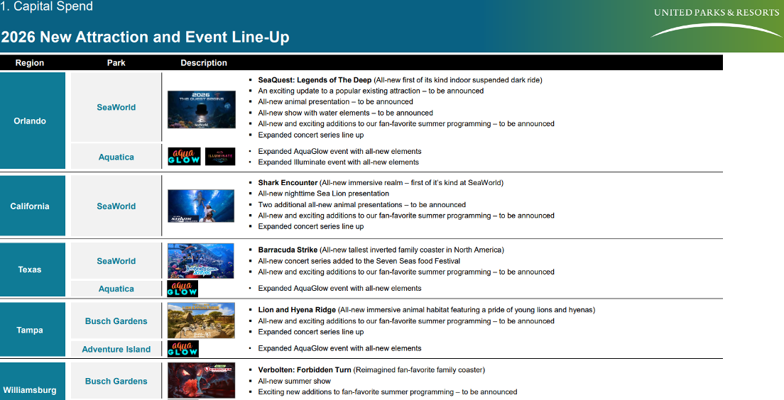 - United Parks & Resorts (SeaWorld, Busch Gardens, etc.) reported roughly flat underlying domestic attendance for the smaller CQ4 period, and a decline in international attendance (similar to other operators).- Domestic attendance was supported by discounting and other inducements. That and the decline in international attendance resulted in a -20% decline in EBITDA.- Despite a lot of new competitive pressure in Orlando, SeaWorld was able to keep the time spent by domestic visitors for Q4 at roughlyflat YoY.- Looking forward to the summer 2026 season, lots of new attractions open across the portfolio with an aim of differentiation, and the goal to grow time spent at the parks, along with revenue and EBITDA.United Parks & Resorts (PRKS) reported Q4 attendance where we expected. Overall attendance fell (-2.6%) due to a steep drop in international visitors and an adverse calendar shift; excluding those, attendance was roughly flat YoY. Advan’s observed visitation figure was a decline of -0.9%. (We do not observe visitation by international travelers.) The flattish domestic attendance was achieved through discounting (revenue per admission declined -2.2%) and other inducements; SG&A increased +17% and EBITDA declined -20%. Readers will recall that PRKS is facing high competition from Universal and Disney, wallet-share losses to cruise (perceived as a better value), and an overall uneven economy (K-shaped).CEO Marc Swanson started the results call saying, “Our fiscal 2025 results did not meet our expectations. While the consumer environment was uneven and our results were impacted by negative international tourism trends and volatile weather during certain peak visitation periods, we should have delivered better results, particularly on the cost side of the income statement. We have moved decisively to address our less-than-optimal cost management and have updated and focused our plans and investments for 2026, designed to drive attendance and guest spending across our parks. These include a compelling lineup of new rides, shows, attractions and updated events calendar, an expanded concert lineup, new and upgraded food and retail locations, a revamped and enhanced marketing plan and strategy, as well as other investments that we expect will drive demand and spending across our parks… For 2026, company has an outstanding lineup of new rides and attractions, popular events and new and improved in-park venues and offerings across its parks. The company's new rides and attractions include the following. At SeaWorld Orlando, we have SEAQuest: Legends of the Deep. Guests will embark on a vibrant submersible adventure through dazzling undersea ecosystems, where they'll encounter extraordinary lifeforms, breathtaking environments, and inspiring stories of the sea. This groundbreaking attraction plunges explorers into an environment of awe and mystery, guided by the SeaWorld Adventure Team.” (See their slide at the end of this report).On Epic’s impact on Orlando, Swanson said, “We think Epic in the market brings more people to Orlando and we have again the opportunity to share in that growth like we have for the last 50-some years that we've been in Orlando. So I would point to the things we're adding in our park, SeaWorld Orlando for example, the new rides attractions. Some of this hasn't been announced, but I can tell you it's some exciting stuff and these are differentiated from what you're going to get at Epic and I think that's a key part of what sets us apart. You're coming here for a different experience. It's a great thing. SeaWorld is a great park in itself. It's a differentiated experience with what we can offer with the animals and some of the rides that are blended in with animal components to them.” Next summer, Advan will track all of the parks of Disney, Universal, and PRKS with a new metric called “utilization,” defined as the product of attendance and average time spent in the park. We see this metric as a strong indicator of guest satisfaction and spending. (Yes, we recognize that longer-than-usual ride wait times will boost the metric, while undermining guest satisfaction; all metrics have pluses & minuses.) For Q4, SeaWorld Orlando (domestic only) experienced flat attendance and a slight increase (+1.2%) in average time, i.e. a more favorable situation than the reported results imply and supportive of Swanson’s characterization of SeaWorld Orlando and Epic.