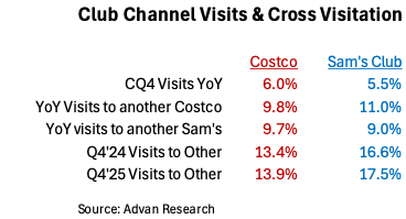 - Walmart again reported strong results for Walmart US and Sam’s Club, with the business model rapidly changing with fast delivery / upgraded merchandise offerings attracting more affluent households and that / retail evolution producing a large profit pool of alternative revenue streams (advertising, etc.) that allows Walmart to lean into EDLP, and drive more separation from incumbent retail. - FQ4 contained a lot of external noise, hurricane comps, government shutdown, a more choiceful lower-end consumer, and yet, Walmart delivered +4.6% US comps, which keeps the 2- and 3-year comp CAGRS largely as they were.- Walmart is especially gaining market share in grocery, as is Club and Amazon. The three are particularly gaining share of the pantry load – a now material headwind to CPG.- Management didn’t indicate any degradation in aggregate US consumer spending; however, they will have certainly noticed that the K-shape is becoming more pronounced, and that’s embedded in their 2026 guidance. As was broadly expected, Walmart reported excellent FQ4 top-line growth for the US, as did Sam’s Club. Walmart US comp-sales of +4.6% can be disaggregated into +5.2% from its “New Businesses” (marketplace, store-delivery, curbside, 3P advertising, and membership fees) and +1.2% from Health & Wellness sales (GLP-1s). Grocery (+MSD) and general merchandise (+LSD) outperformed their benchmarks. Advan shows\ traffic +4.4%\\ and average ticket +0.5%, and an increase in visit frequency. The more modest increase in average ticket (+0.5%), relative to the reported comp-ticket (+2.0%), reflects GLP-1’s (frequently 3P paid vs. 1P). The +0.5% observed figure and the increase in visit frequency reflects consumers’ shopping deals and the paycheck cycle. CEO John Furner (the new sheriff) said, “Again, this quarter, the majority of our share gains came from households making more than $100,000. For households earning below $50,000, we continue to see that wallets are stretched. And in some cases, people are managing spending paycheck to paycheck.”Per New Businesses’ +5.2%, the absolute level of growth was +29%, ahead of Advan’s transaction data (+20.4%) due to faster growth in advertising (+50%) and membership fees (+double-digits%). Of note, the combination of advertising income and membership fees represents nearly 1/3 of operating income, and when including marketplace revenue, the figure is in the high-30s. This large pool of fast growing revenue allows Walmart a lot of flexibility to be tight on price; a large competitive / business model challenge facing Target, Albertsons, and others.Back to the +20% increase per Advan, that reflects Walmart’ gains in more affluent households (the ones that are willing to pay for the convenience of delivery). Advan shows that the increase is largely transaction. This “channel figure” debits the inside-the-store metric, but since store delivery (+50%) utilizes the store, we credit it back to the store. As such, on an underlying basis, and centered on the store, the comp-sales increase excluding RX was up, driven by traffic (again shopping for deals and the paycheck cycle). Relatedly, overall general merchandise “units” were down on a comp-basis as strong demand by affluent households, was more than offset by a pullback by less affluent households (see our Q3 note). Demonstrating the “affluent bump,” in marketplace, the categories fashion, cook, dining, and home décor increased >40%. But that leaves general merchandise sales inside-the-store at down. Yes, the K-shaped economy is well represented in Walmart’s results. It also suggests that expectations should be moderated for the results by the dollar stores.Per the +MSD comp increase in grocery – that’s largely more units, with outperformance by Walmart’s house brands. Walmart outperformed the at-home\\ category (+3.3%), especially in units as at-home inflation was +2.0% vs Walmart’s +0.6%. Walmart is winning market share given its EDLP value brand positioning / promise -- a promise reinforced in consumers’ mind given that its: pricing adjustments are lagging inflation at retail, investments behind its house brands, and strong advertising campaigns (especially over the holiday).Loyal readers will recall that we’ve been writing that the grocery category’s growth would be driven by private label and the brands that excel at it since 2023 (latest here); that’s what Walmart is leaning into. Obviously, that creates volume pressure on national brands (in Wall Street parlance called “Big Food”); just this week’s CAGNY conference, General Mills lowered its annual guidance (again). For General Mills, profit for the year is now expected to decline -20%. At the conference, General Mills and other Big Food brands noted that consumers continue to shop on promotion (leading to more retail traffic, but lower basket sizes) and channel mix pressure (more shopping happening at Club, mass, and Amazon), which given these retailers’ large scale and buying powers, leads to lower realized pricing for the CPG brands. (Here).Per GLP-1s (another frequent topic of ours), to Walmart and other retailers with a pharmacy business, GLP-1 could be less of a driver to sales in 2026 given the category’s significant price declines. However, those declines will drive faster unit growth, as will the pill format, and the significant increase in category advertising (see the Super Bowl). As such, the absolute volume growth should be a 1.5-2X increase from 2025’s level. That’s both a headwind and tailwind to food retail (both grocers and limited-service restaurants). For Walmart, it can lean into its offerings in produce, high-protein merchandise, and connectedness with consumers to offer compelling solutions to the evolving consumer need. (Successful execution remains to be proven.) Additionally, that connectedness and a portfolio of produce give Walmart (and retail) more tools to meet the changing