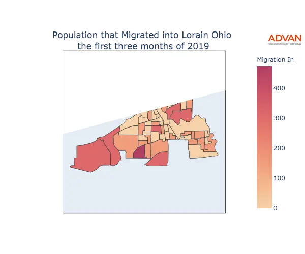 The map below shows the migration into Lorain by Census Block Group (CBG).