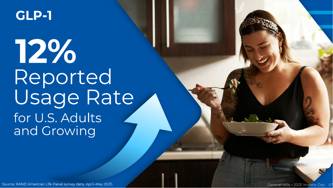 General Mills executive Dana McNabb shared, “The latest research indicates GLP-1 usage among U.S. adults is around 12%, and it’s expected to grow. And our own studies indicate that users are generally split into two groups. One group that largely eats the same foods they always did, just in smaller quantities and portion sizes; and one group that makes more significant changes to their diet. They look for specific product attributes such as protein, for muscle mass and fiber for digestion. In fiscal ‘26, we’re taking action to help address the most critical GLP-1 user needs, leaning into categories that over-index with these consumers like soup, snack bars and cereal. A positive is that many GLP-1 user needs overlap with the needs of our 55-plus consumers. This means the protein innovation and the portion-controlled offerings I just mentioned are going to benefit us with GLP-1 users as well. “