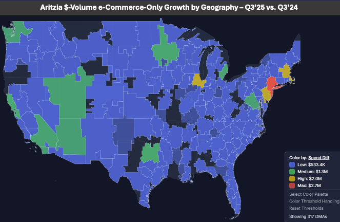 Back to the topic of strong e-commerce-only markets proceeding getting their first boutique. 10 new locations are planned for 2026. The graphic below shows YoY $-growth Q3’25 vs. Q3’24 by DMA for Aritzia’s e-commerce business alone. (Annualized the growth would be 4X). Three markets stand out as likely for their first boutique - Phoenix, Fort Worth, and Detroit.me