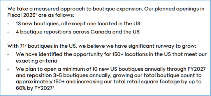 - Aritzia plans 10 new openings per year in the US (on a base of 71); based upon large e-commerce-only $-growth in Phoenix, Fort Worth, and Detroit, these three are likely to be of 2026’s store openings.