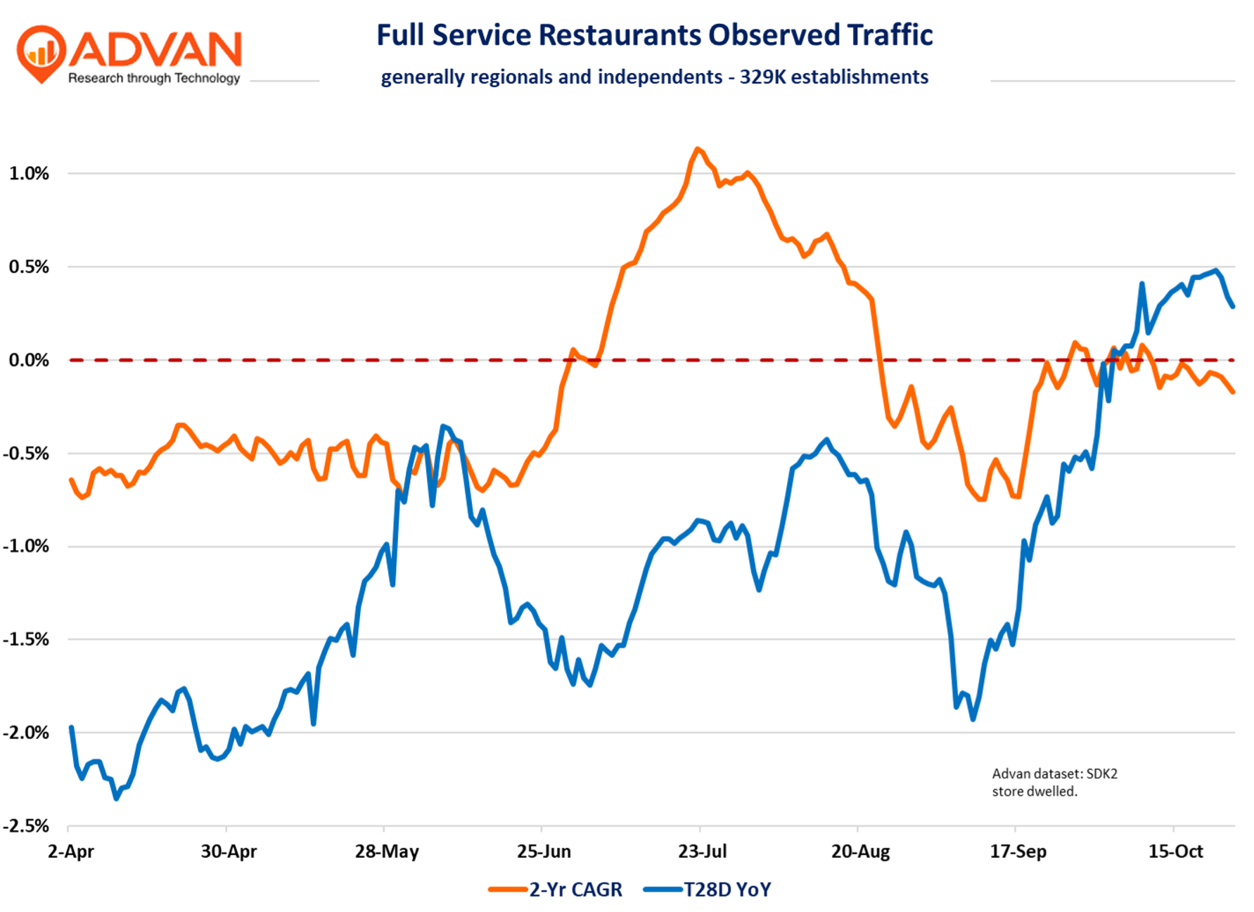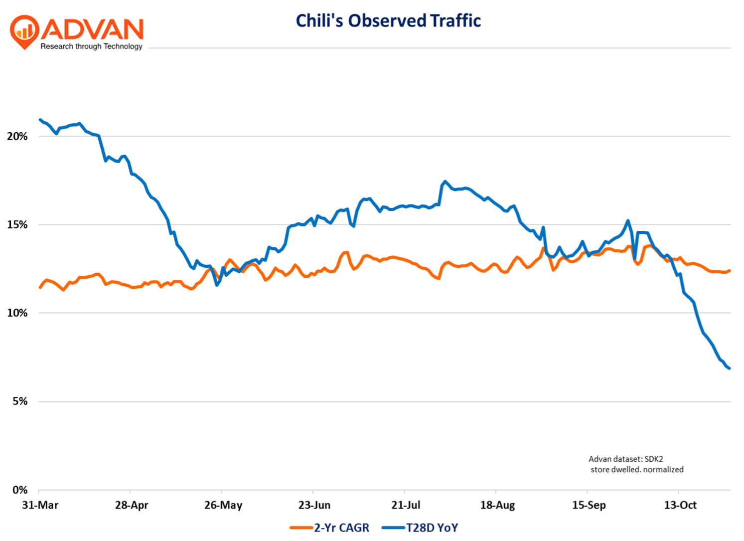 Chili’s outstanding market share gains continues with FQ1 comp-traffic gaining +13% which drove a similar gain QoQ in the 3-year comp CAGR (+4.2%). (Brinker’s fiscal quarter ended September 24th.) Price and mix each added 4 pts, taking the comp-sales increase to 21.4%. As a reminder, industry sales growth is only +4% range*, and so, Chili’s is 5X that. FQ1’s strong comps also drove robust increases in margins and earnings, with Chili’s restaurant operating margin hitting 17.3%. Observed traffic (Advan) shows a similar cadence on a 2-year CAGR basis, against last year’s atypical period in September and October (hurricane). That 2-year consistency supports CEO Kevin Hochman’s noted confidence in the press release, “Our consistent investments in food, service, and atmosphere, combined with strong plans, give us confidence we can build on this growth and successfully lap the high sales comparisons in FQ2 & FQ3.” (These periods had comp-sales increases just above 31%; yes, incredible gains.) CFO Mika Ware, “ Chili’s [October comp] sales are in the high single digits, and our expectations are Chili’s same-store sales will normalize on average in the mid-single-digit range for the balance of the fiscal year.” Adding contributions from price and mix to the traffic shown below, gets one to the high single digits, if not above.