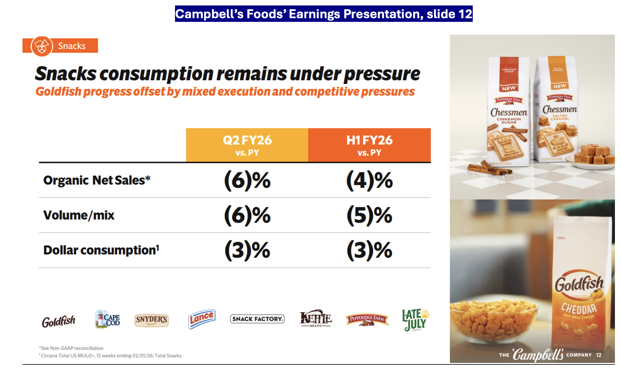 This week brought our theme to light again with Campbell’s reporting disappointing results; Campbell’s earnings for its fiscal year are now expected to decline -25%, a reduction from its prior outlook of -15%, with the guidance reduction due to weaker volumes and a weaker channel mix. Another driver of strong availability in consumables for OLLI may be that Frito-Lay recently won a significant increase in shelf distribution; Pepsi’s CEO Ramon Laguarta said on its Q4 call, “Just to give you a number, the average space gain for Frito-Lay in the new resets of both the main aisle and the perimeter will be double digit. So we’ll be growing double-digit space in Frito-Lay from the March, April time frame when most of our partners start changing their layout. So this is a good return for us and a great return for the category as well. And this category needs to grow. It’s very relevant for our partners, it’s relevant for us.” That’s a lot of disruption in the snacking shelf space and it doesn’t reflect more shelf space for the category, it means less shelf space for competitors, like Campbell’s. As such, that leads to less sell-in by Campbell’s into the channel; moreover, in the short-term it also means more liquidated and cancelled orders – product that OLLI likely bought up on the cheap. On its chip business for the quarter, Campbell’s said, “Turning to Salty Snacks, the sequential progress within Pretzels was offset by competitive headwinds in Chips.” Overall, this is why the volume / mix component, shown in the slide below at -6%, is worse than the dollar consumption figure of -3%.