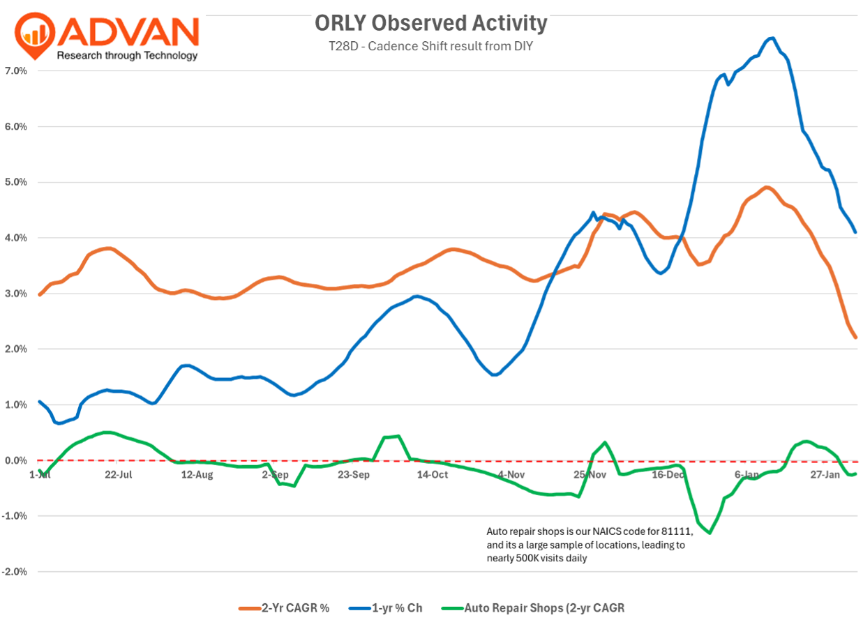 In our prior notes, we’ve highlighted O’Reilly’s intention to enter the Northeast. Over the past six months, O’Reilly added 10 new locations on the East Coast, above Georgia, and 17 new locations in Texas (see our Texas note here ). On the expansion Beckham said, “I always like to talk about the fact that, depending on where you draw the line there in the upper Mid-Atlantic, between Virginia and getting all the way through to New York City, you can almost come up with 1/3 of the population of the U.S. and all the vehicles to go along with it, all the market share to go along with it, though you obviously have a lot of tough competitors, large and small. But we look at really the way that we’re going to store that market, really no different… Our real estate teams are getting after that market, not only from a greenfield perspective, but also from a potential acquisition perspective. You’ve heard us talk about the Salvo acquisition of those 7 stores in the Baltimore, Maryland market. And really the whole key to that distribution center, besides the 5 night-a-week replenishment that we can service out a couple of hundred miles, is that model where have well over 150,000 SKUs, once you build that DC out once you build out the store network, that will service not only overnight, but will service that Greater Washington, D.C. market basically every hour on the hour in that greater metro area, which provides just an unbelievable advantage over most every competitor we have, if not all of them. And then we’ll backfill that with our hub-and-spoke model no different than we have in any other parts of the country. Knowing there’s a lot of traffic, a lot of cars in that market. We’re going to make sure that all those runs from that city counter out of that DC, as well as any hub stores, we’re going to make sure that it’s absolutely appropriate for that market share that we know we can go get… When I think about the ability that our team has given us, from Brent to the entire supply chain team, as we’ve opened these DCs, we’ve opened up capacity not just in 1 or 2 DCs. For example, in our network, we don’t just have capacity, now that we’ve opened Virginia, in Greensboro and outside Akron, Ohio, out there in Twinsburg, we actually, when you lever those DCs, you end up levering the next layer South and East and back West. And so that enables us to have backfill markets the same in a lot of our core, more mature markets.” See our last write-up on category trends here . ‘* Credit card (AltData) data largely doesn’t capture the commercial business because it’s a billed business. ** Adjusting for NSP of 60%. Others reported a +7.6% increase on a similar basis. ‘*** The trend was -90bps slower, but that is too precise to be meaningful. Advan’s measurement of NAICS 81111 is a large data set and capturing around repairs / servicing per day (assuming 2 visits per service).