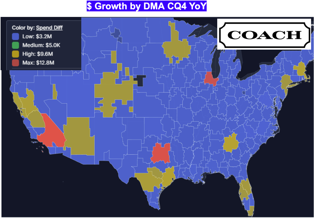 Shown on the third page, geographically by DMA, Coach is driving the most $-volume growth in LA, Chicago, and Dallas. Additionally, Minneapolis, Denver, and Tampa were also big drivers relative to their size. (Shown here is DTC consumer spend on the brands, which includes ecommerce, but excludes wholesale.) By contrast, for Ralph Lauren, it’s Houston, Miami, and Philadelphia. As shown, Denver, LA, and Dallas were also strong. Between the two brands, one can see that the outsized DMA $-growth are 2.6X higher in Coach’s favor. Coach’s US DTC business (both retail + ecommerce) is larger than Ralph Lauren’s DTC at $3.1B vs. $2.0B, but that’s only a 1.5X ratio. The 2.6X versus 1.5X indicates that while both are gaining market share, Coach is gaining more on a relative basis. That’s curious because Ralph has a much larger men’s business and it participates in more categories.