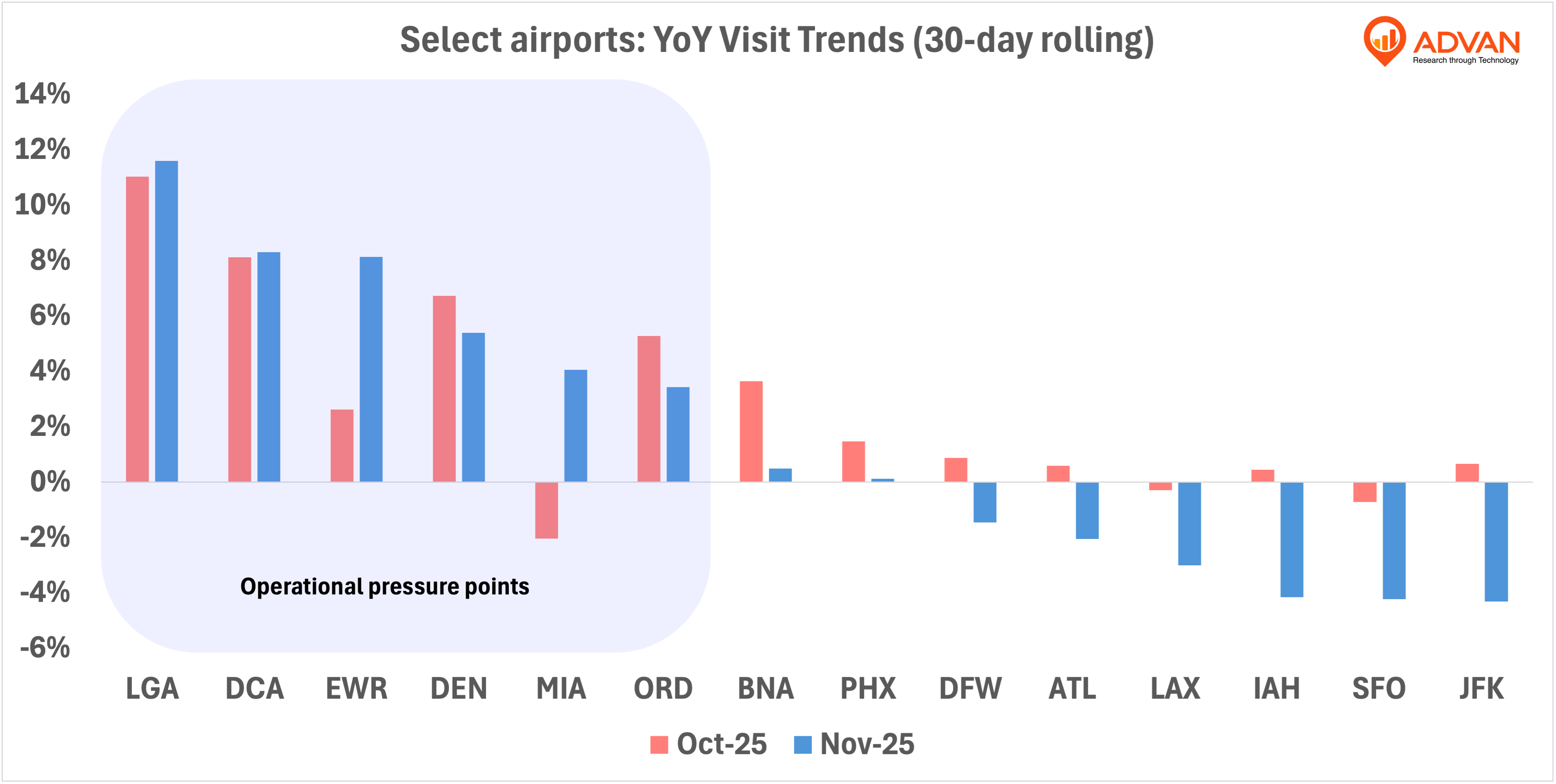 When systems come under stress, the national averages can hide more than they reveal. But once you layer TSA’s ground truth on top of Advan’s airport-level signal, the pattern is clear: the shutdown didn’t simply “slow down” air travel, it reshaped where and when the pressure landed.