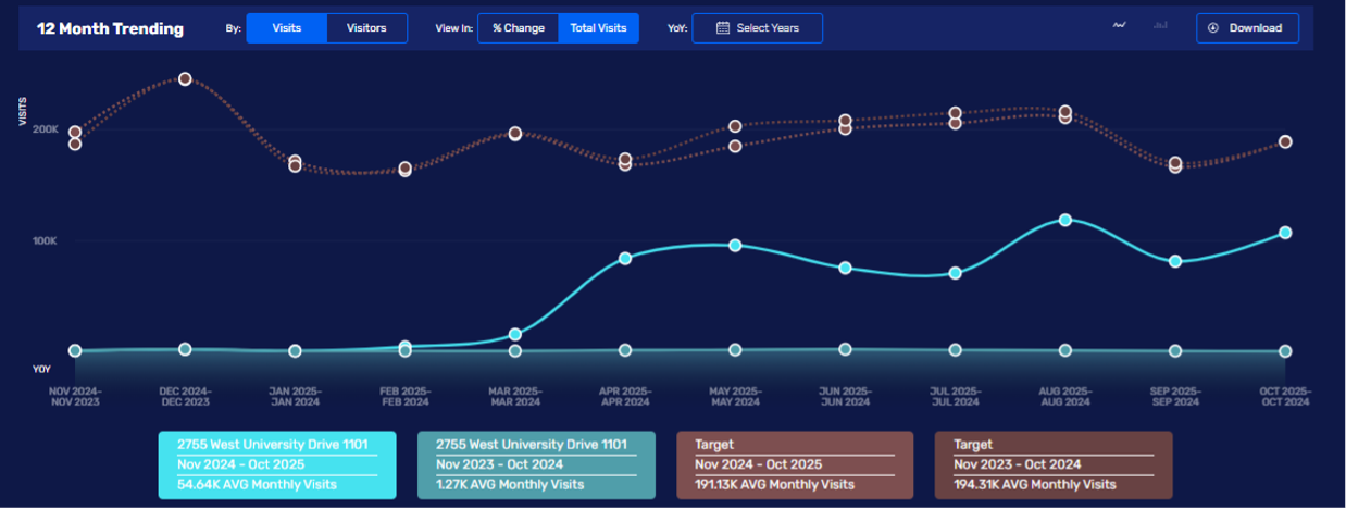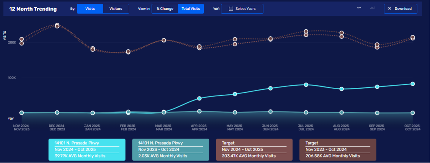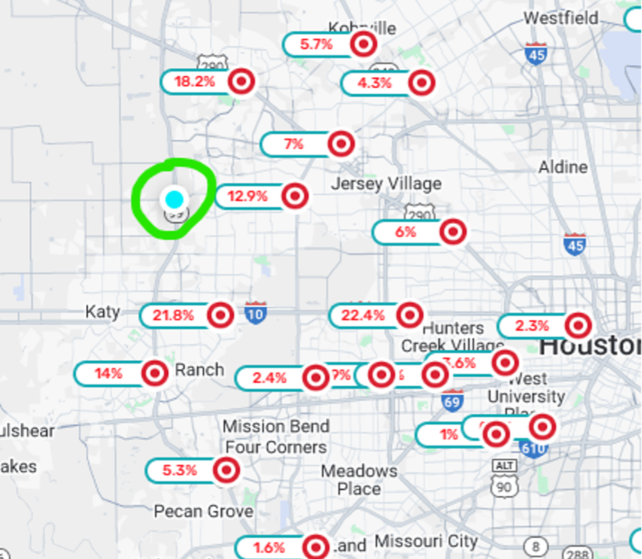The first two figures below show visits to two new openings (April) of these bigger box stores, the first northwest of Phoenix and the second, northwest of Dallas. Monthly traffic has trended higher since opening to around 100K visits, which is roughly half the 200K visits the regions’ average. The third chart is the Dallas market and Target’s first bigger box store (Katy, Texas) at 140K. What’s shown on the map is shared visits from the Katy store (the green circle) with the other Target locations in the region. The Katy store, despite being on the edge of the region, matches the region’s average. And taken together, half of the Katy shoppers are incremental to Target’s business within the region, meaning that’s their only Target store.