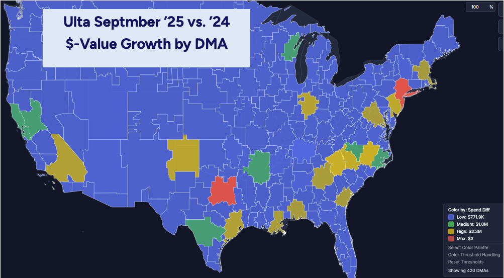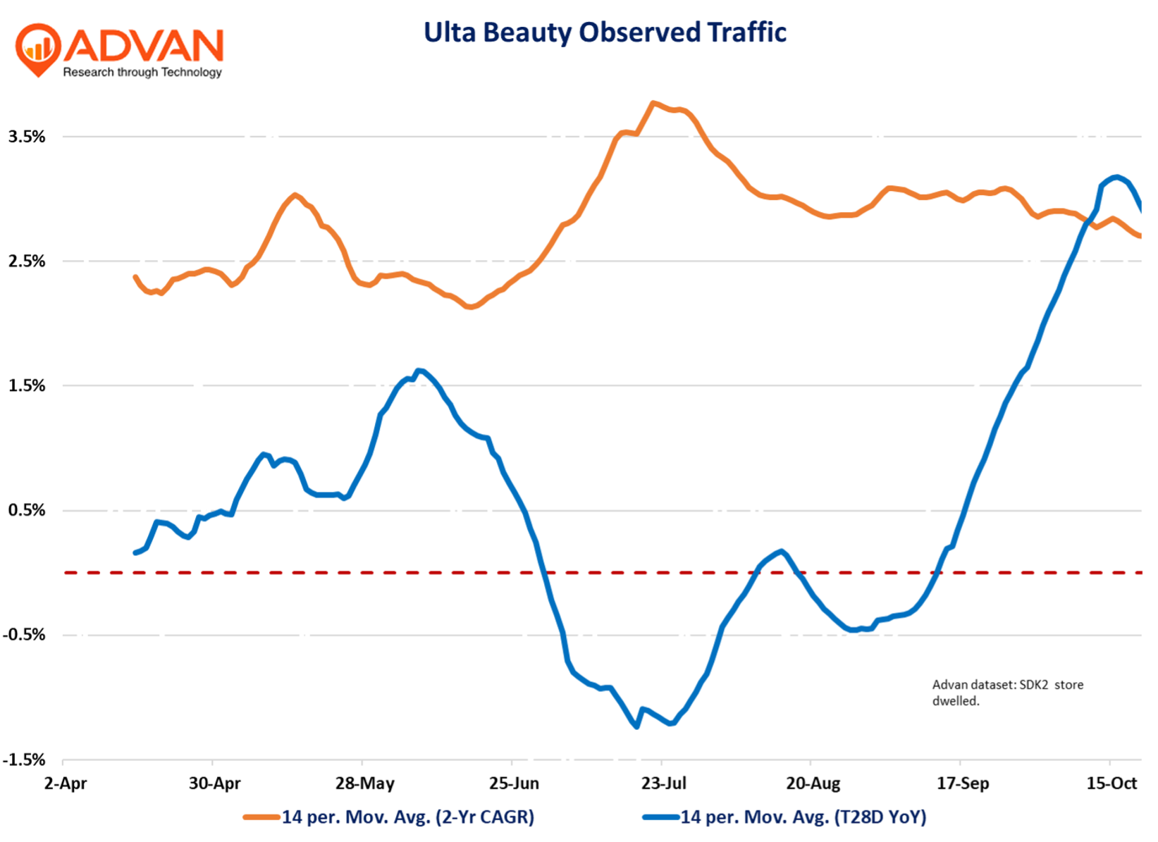 In September, head of stores Amiee Thomas updated investors on the progress of Beauty Unleashed, “We’ve launched new brands, several new brands, 43 new brands, many of which are exclusive brands to Ulta Beauty. Our in-stock levels are better than they have ever been, and that has really been driven by process changes upstream and collaboration that’s happening within our corporate teams within merchandising, marketing, and retail operations… We’ve launched and we executed 30,000 events in our stores this last quarter and are tracking to do over 70,000 events this year, which is 40% more than we executed against last year. And our guests are telling us they’re noticing. Our NPS scores are growing year-over-year, and our guests are taking notice and loving what we’re doing. Within the accretive business category, we launched an expanded wellness… We’re also seeing lift in conversion in our loyalty member growth as well as our NPS scores. So we are doubling down on our Ulta Beauty Unleashed program because we know that, coupled with our unique model, it is going to deliver success and growth for not just this year in 2026 but for years to come.” And so, lots of positives there. We also see progress in Advan’s data for Ulta.