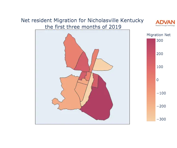 The map below shows the migration into Nicholasville by Census Block Group (CBG).