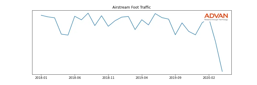 Advan Research collects and manually verifies all the individual Airstream locations worldwide, on a point-in-time basis. These detailed locations, also called Points Of Interest or POIs, are then used by Advan to compute how many mobile phones have visited the locations. Advan computes cellphone traffic using a dataset of more than 320 million cellphones observed with a second-level time accuracy and 10 meter location accuracy, since 2015. The graph below shows the visits aggregated across all 13 of the locations of Airstream: